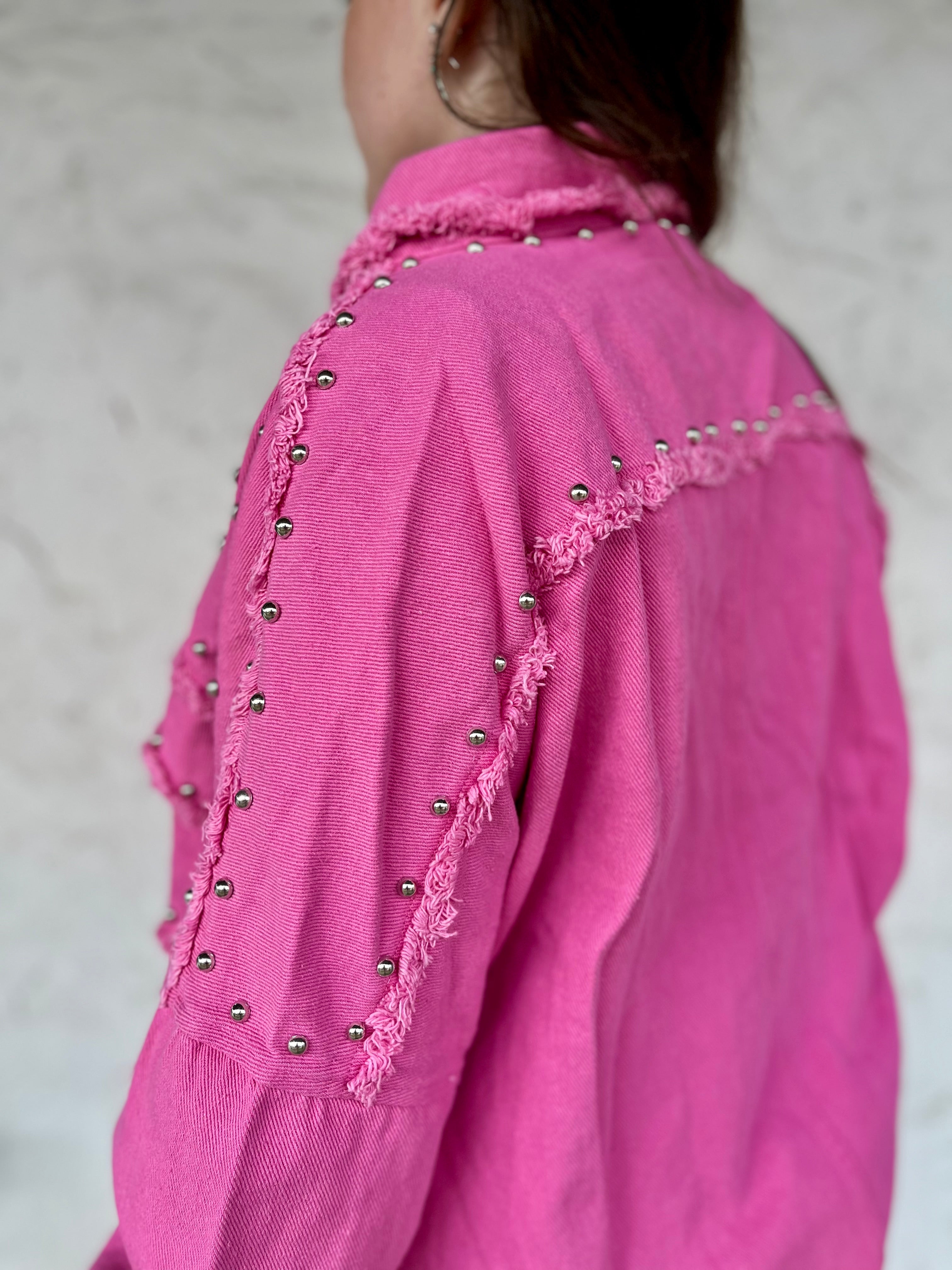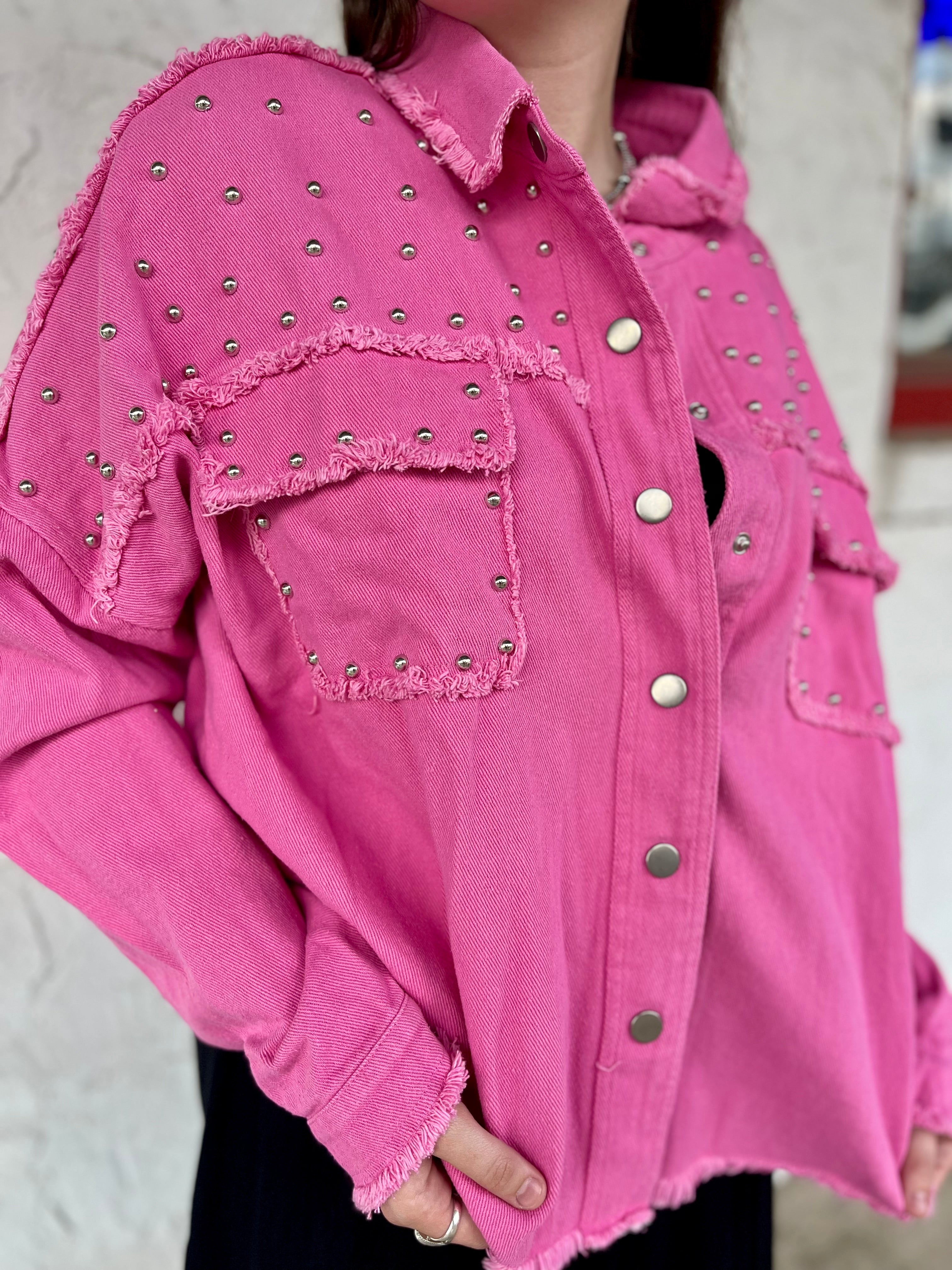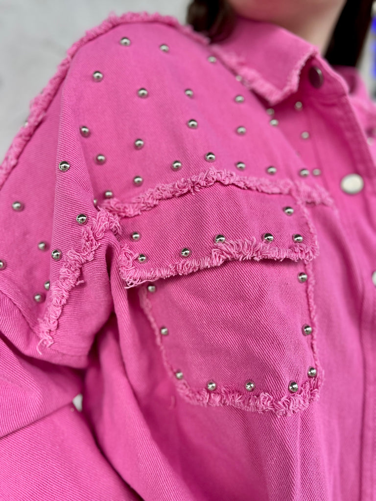 Feel fierce and fashionable in our Bubble Pink Studded Jacket! This corded jacket features shiny silver studs that add a touch of edginess to the feminine pink color. Elevate any outfit with this statement piece.