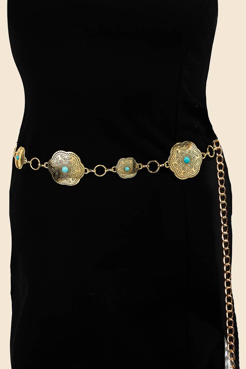 Effortlessly elevate your outfit, this chain belt comes with a special floral disc western concho design. A versatile chain belt that's perfect for any occasion, adding a touch of elegance and style to any outfit. Available in G and S. This item is sold in packs of 1.