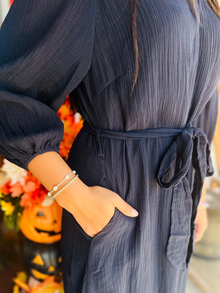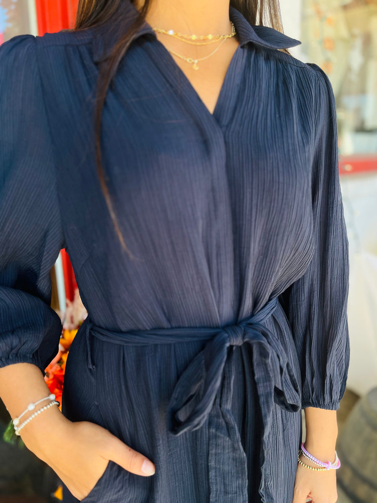 Slip into effortless elegance with our light weight navy tie waist midi dress. The perfect addition to your wardrobe, this dress offers a comfortable and stylish option for any occasion. Featuring a flattering tie waist, it will accentuate your silhouette and make you feel confident and beautiful. Elevate your style game with this must-have dress!