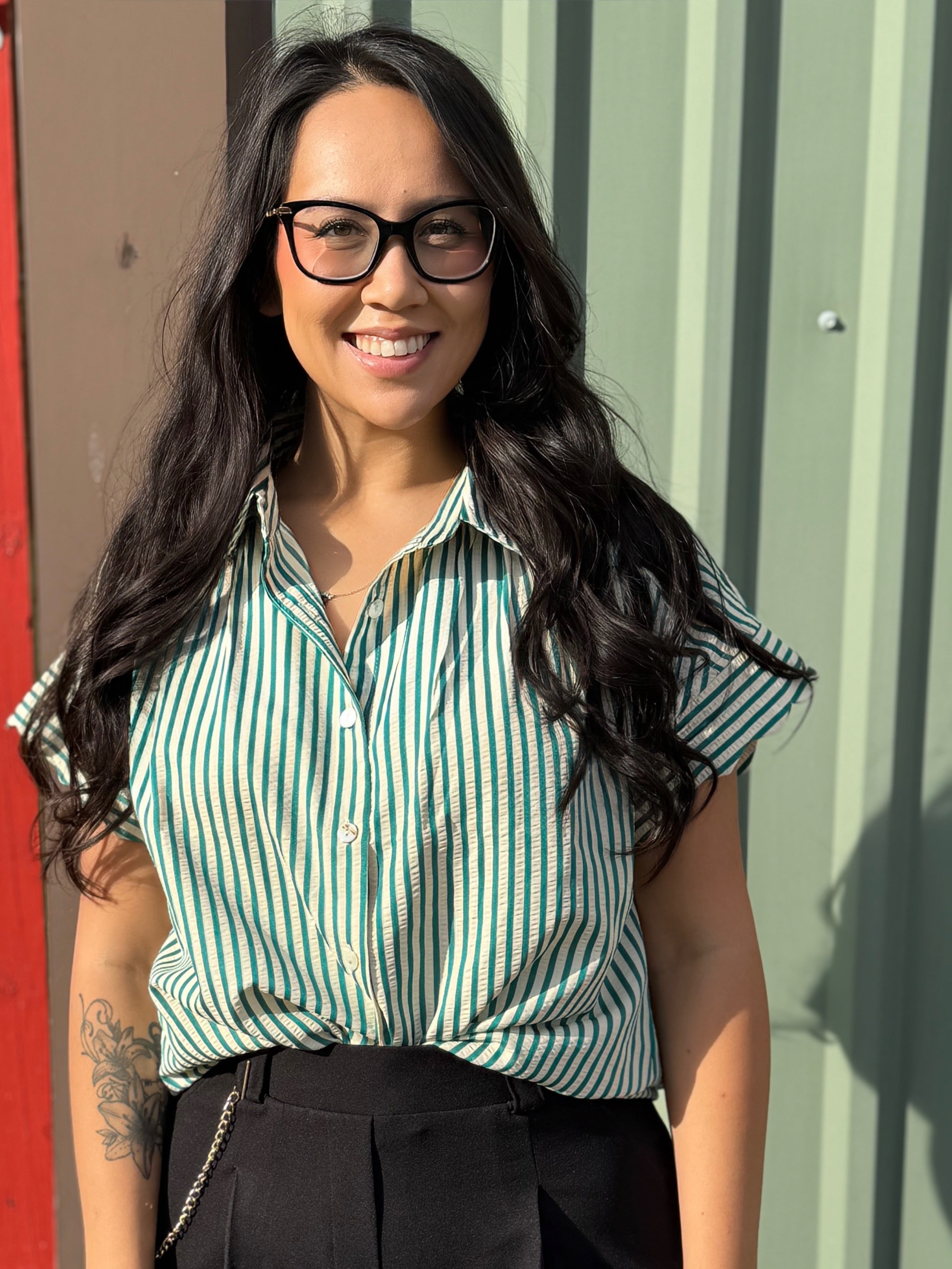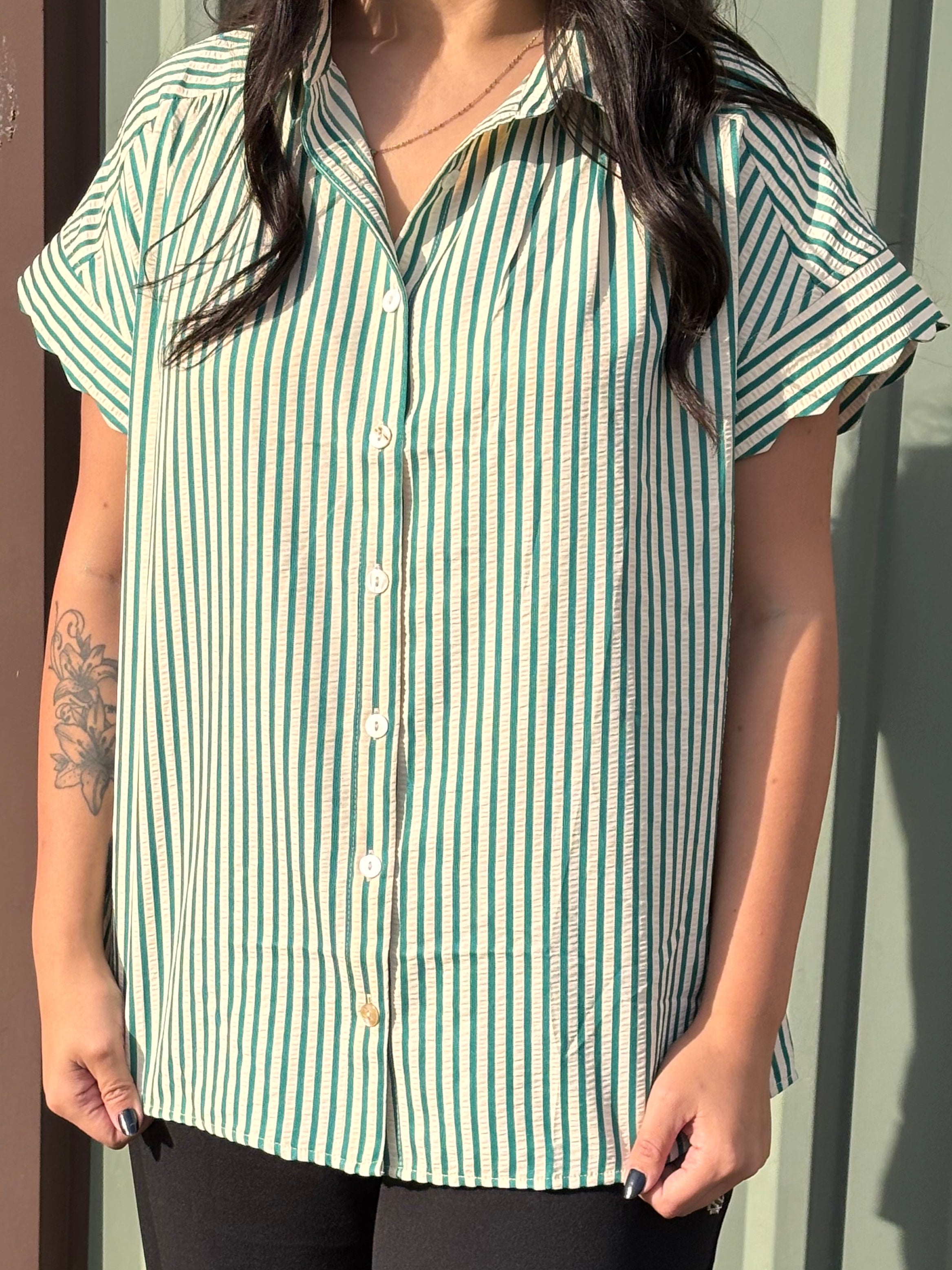 Make a statement with this Kelly Stripe button-up top, designed to transition seamlessly from desk to dinner. Featuring a refined vertical stripe pattern in kelly green and cream, this collared shirring top combines structured sophistication with relaxed elegance. The signature scalloped dolman sleeves add dimension and movement, while the button-down front ensures easy styling versatility. Perfect for layering or wearing as a standalone piece, this top delivers the polished finish that works harder than your everyday basics.