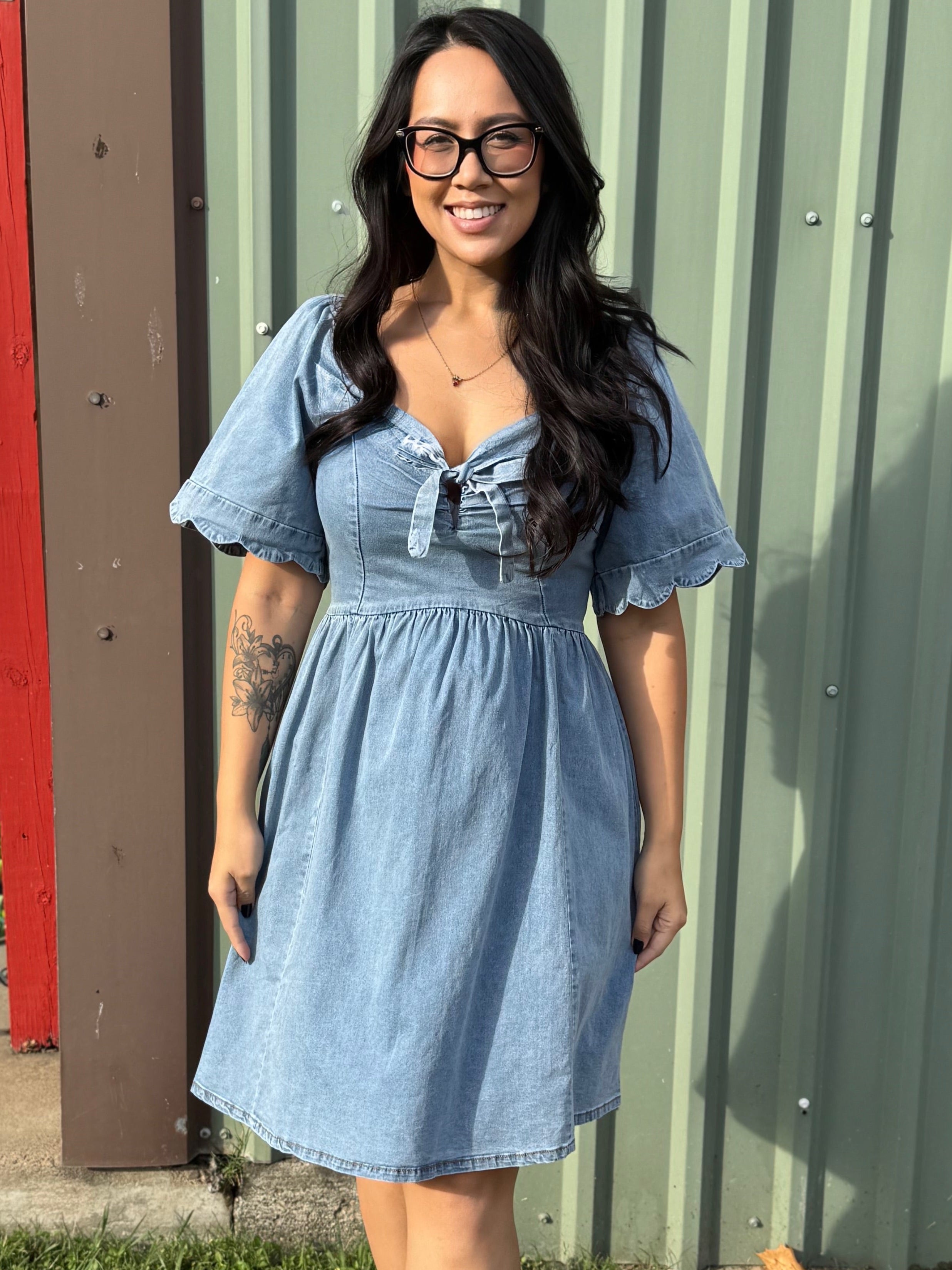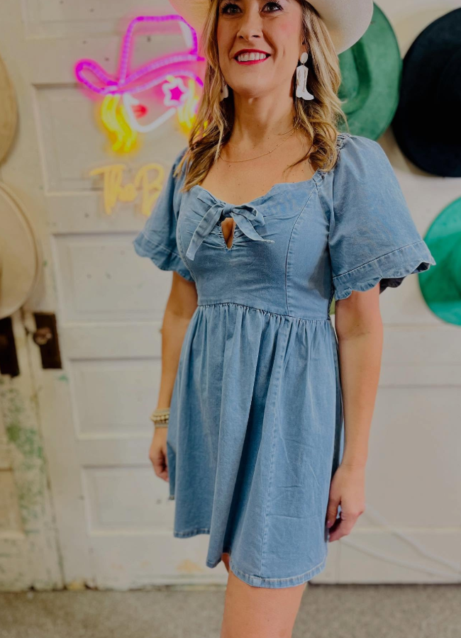 Effortless style meets timeless denim in this charming tie-front dress. The relaxed, flowy silhouette drapes beautifully with strategic ruching at the back for a flattering fit that moves with you. Delicate scalloped sleeves add a feminine touch that elevates the classic denim look. Perfect for casual outings or dressed up for weekend adventures—this versatile piece transitions seamlessly from day to night.