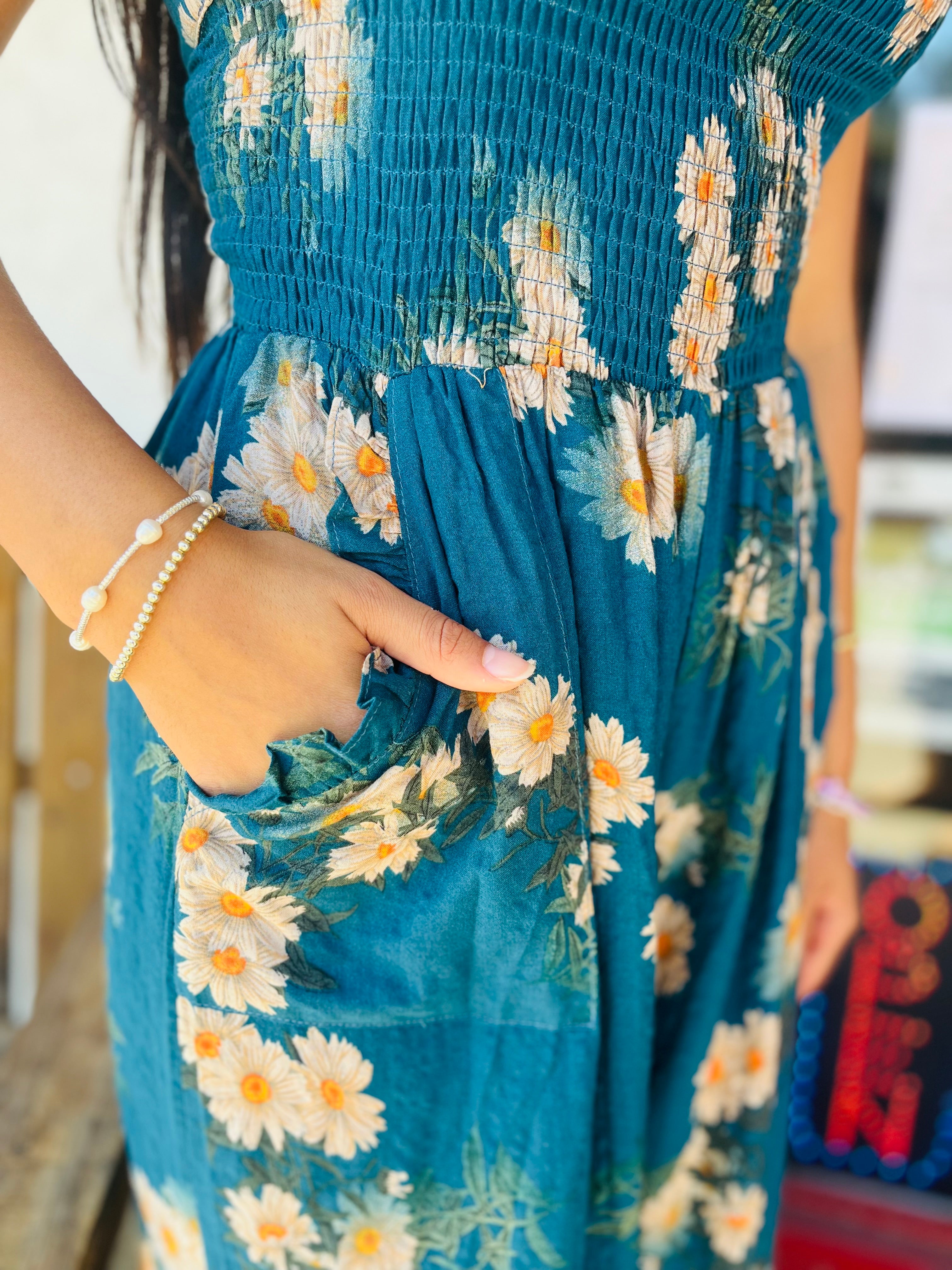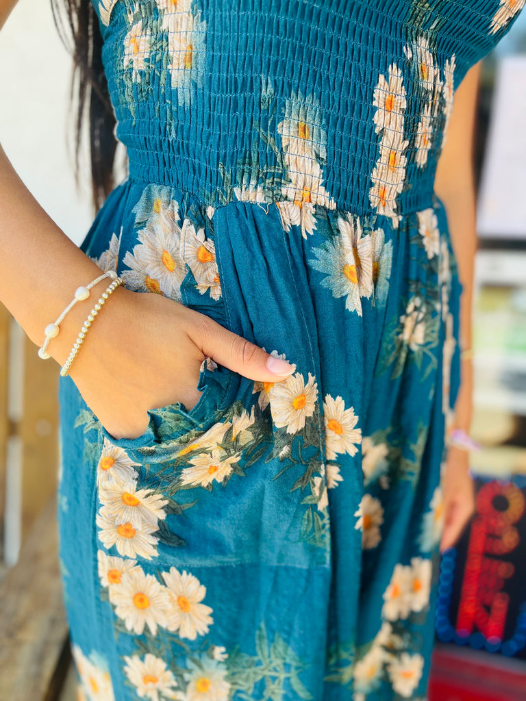 Indulge in the beauty and charm of our Daisy Dreams Jumpsuit! This stunning deep blue jumpsuit features a delicate daisy pattern, accented with playful ruffles. Make a bold and stylish statement wherever you go. Perfect for a day out or a special occasion.