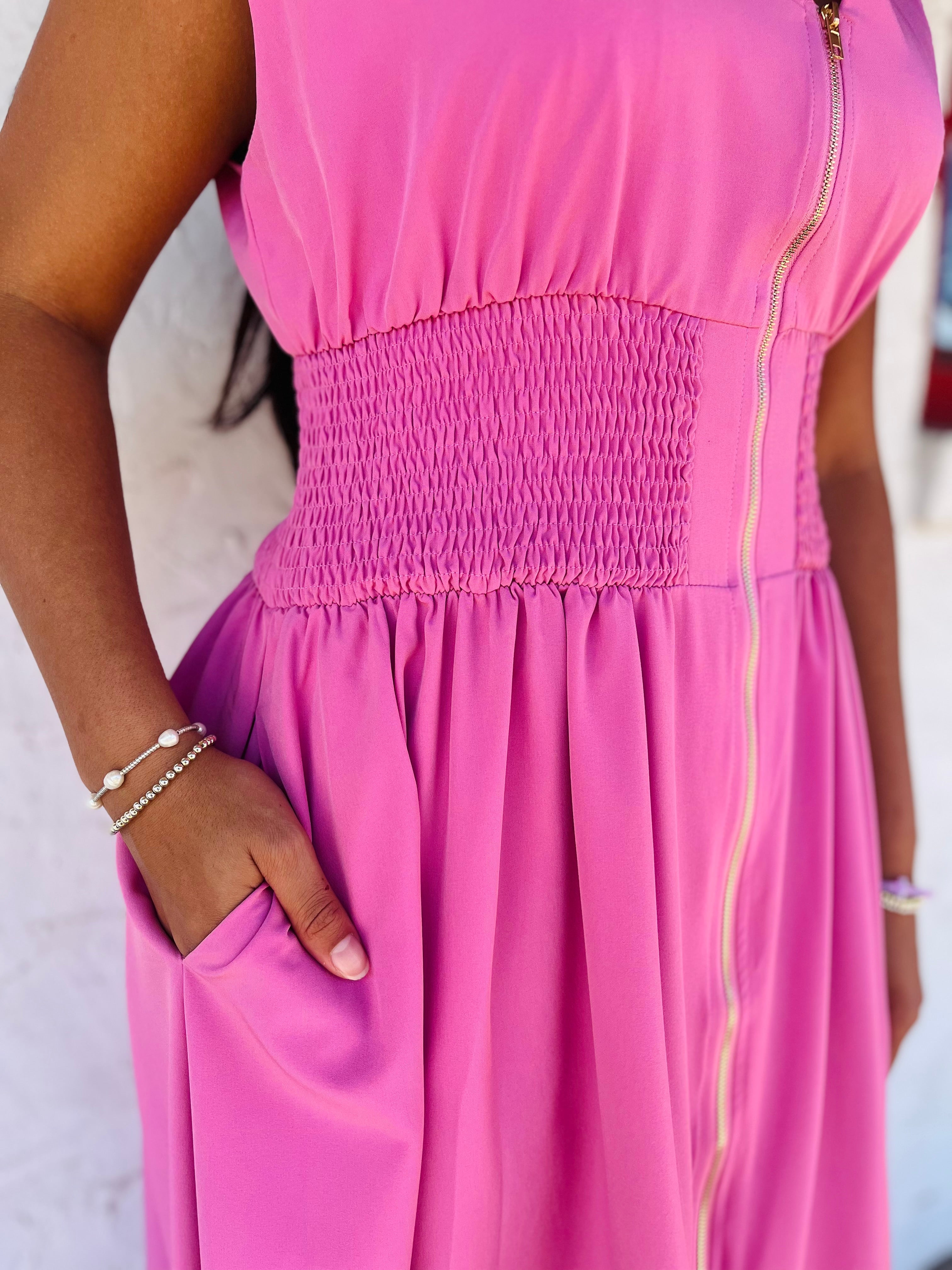 Fresh and vibrant, this pink zip-front dress offers easy elegance with a playful twist. Featuring a cap sleeve, front zipper detail, and flowy silhouette, it's equal parts comfortable and stylish.