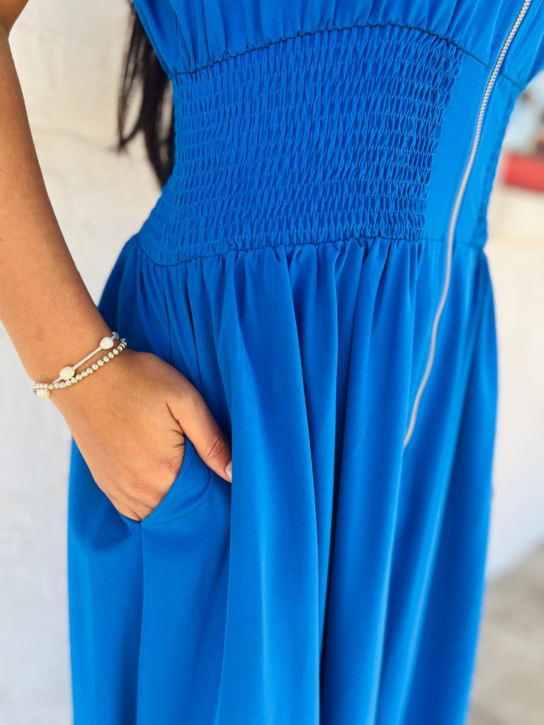 Introducing our Ocean Breeze Zip Up Dress, featuring a figure-flattering smocked waistband and a soft flowing skirt for effortless style. The minimalist silhouette is complemented by a v neckline and full length zipper, all in a vibrant ocean blue color that will transport you to the beach.