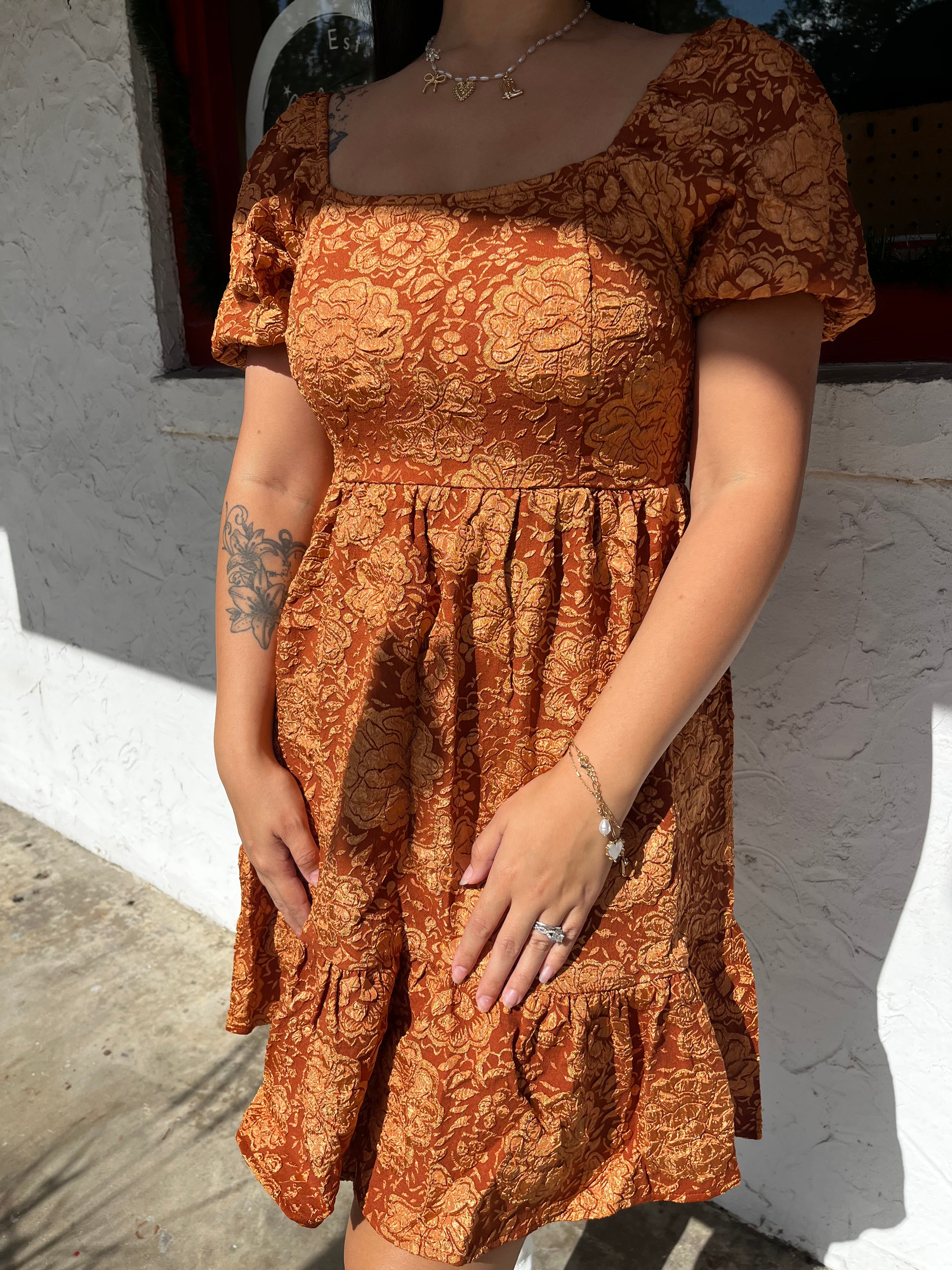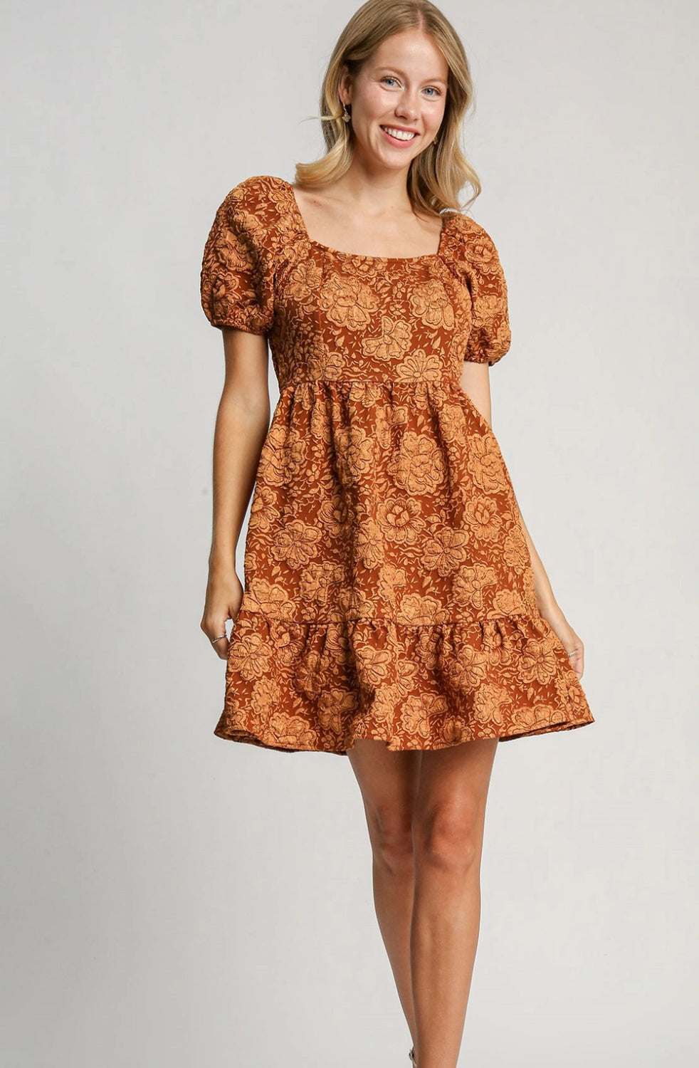 This charming Sienna puff sleeve dress features a flattering babydoll design with a square neckline and smocked back. The delicate puff sleeves add a touch of femininity while the vibrant rust color and floral print make it a standout piece. Perfect for any occasion, this dress will make you feel confident and beautiful!