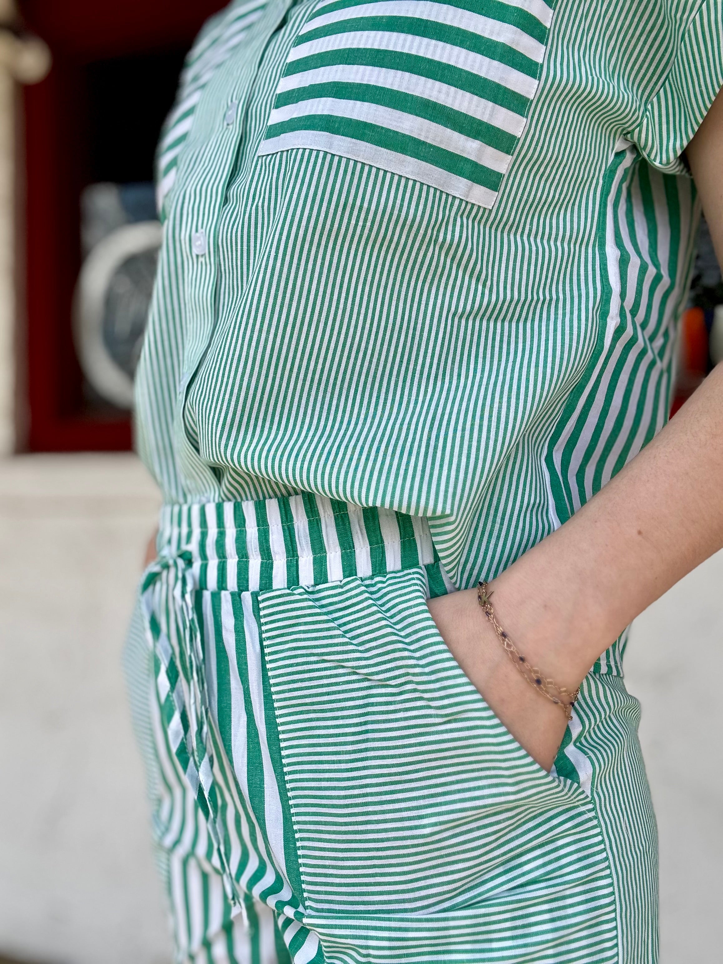 Get ready to strut your stuff in the Greener Days Stripe Set—it's like a picnic for your wardrobe! This playful green and white striped duo features a breezy button-down top with chest pockets (perfect for stashing snacks) and comfy drawstring shorts. Ideal for those days when you want to look cute without trying too hard (because who has the time?).