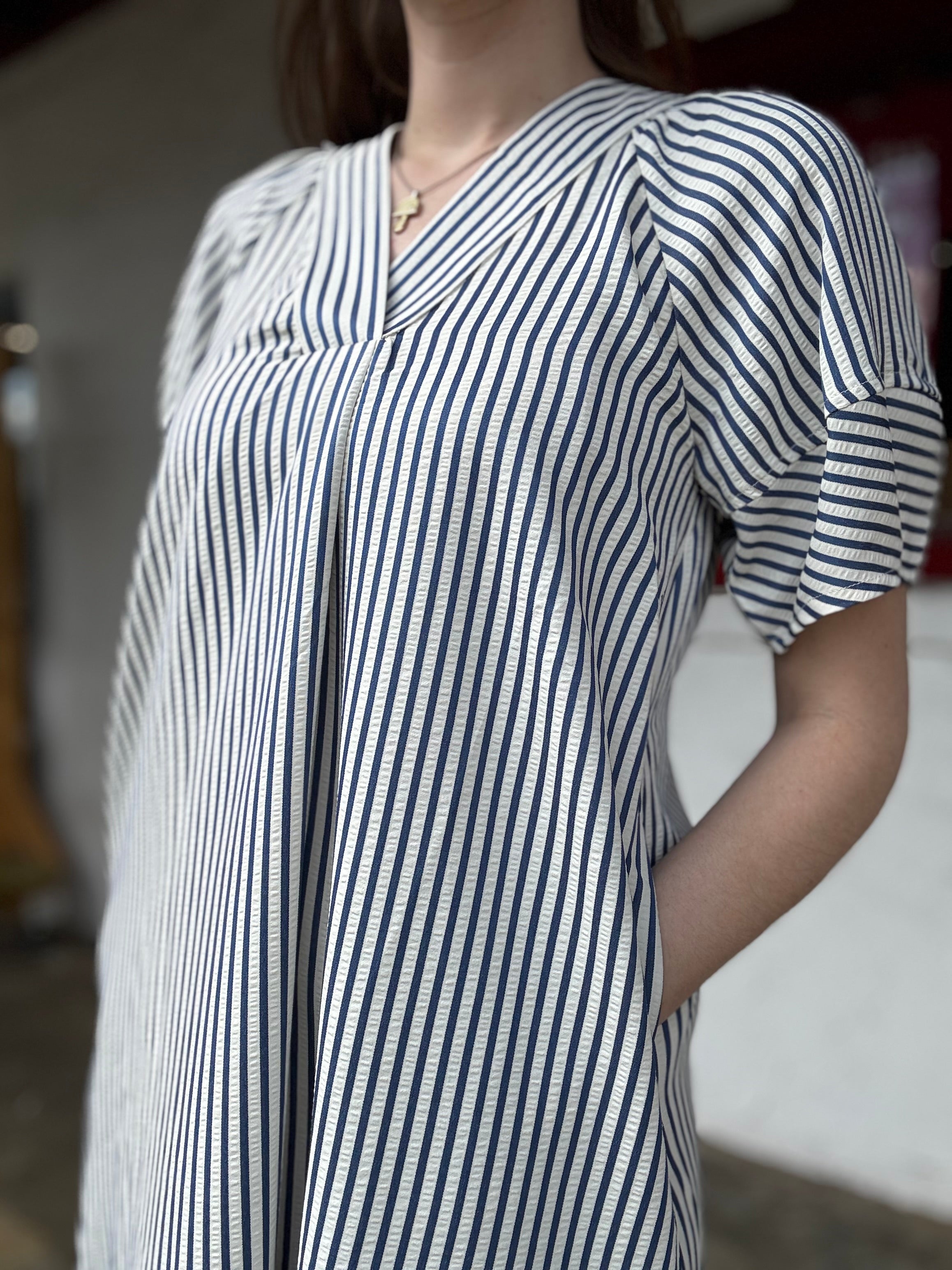 Embrace effortless style with our Indigo Striped Dress. This lightweight midi dress features a classic indigo and white stripe design, perfect for staying cool and comfortable all day. It's ideal for casual outings or relaxed gatherings, making it a versatile addition to your wardrobe.