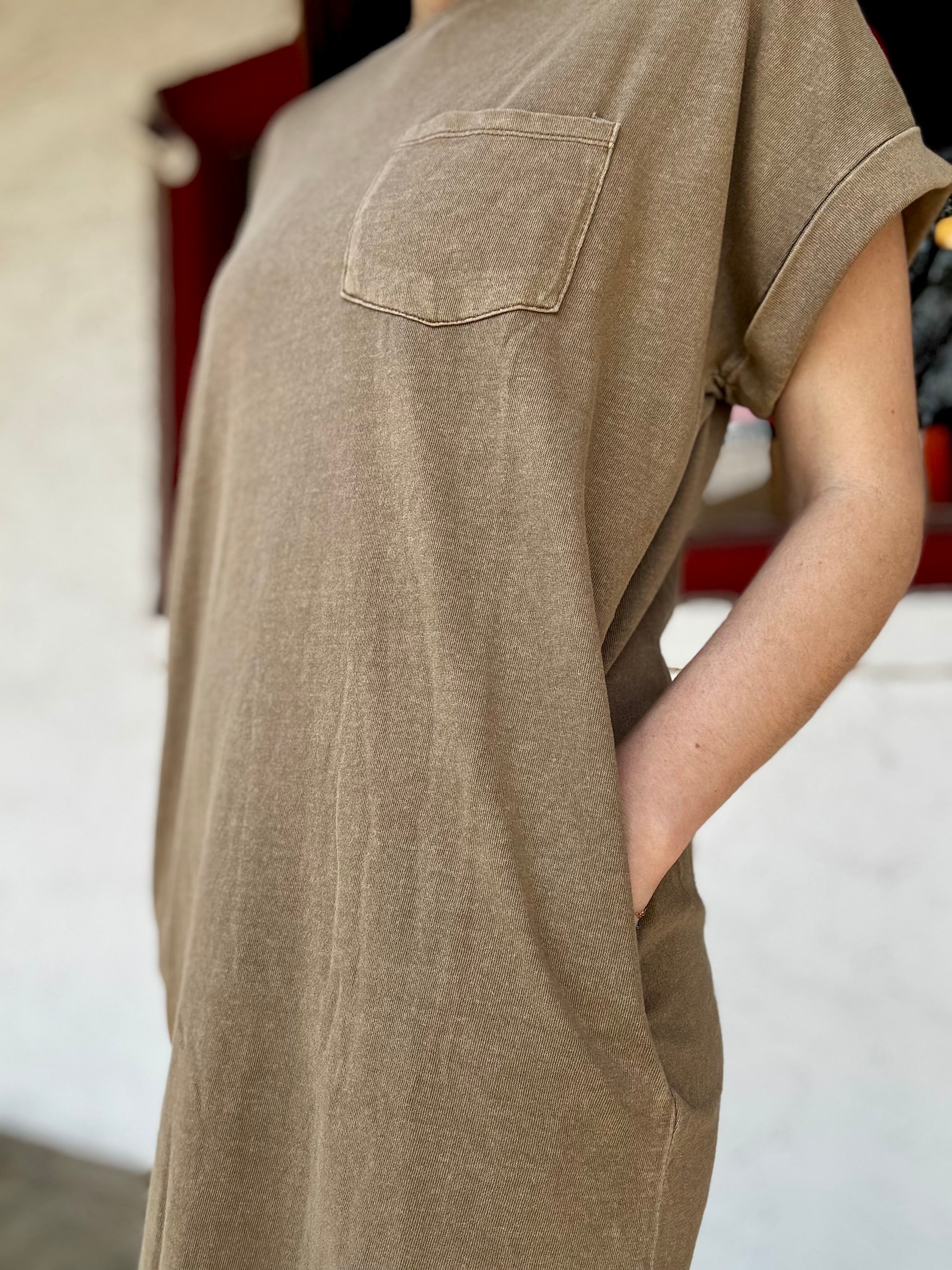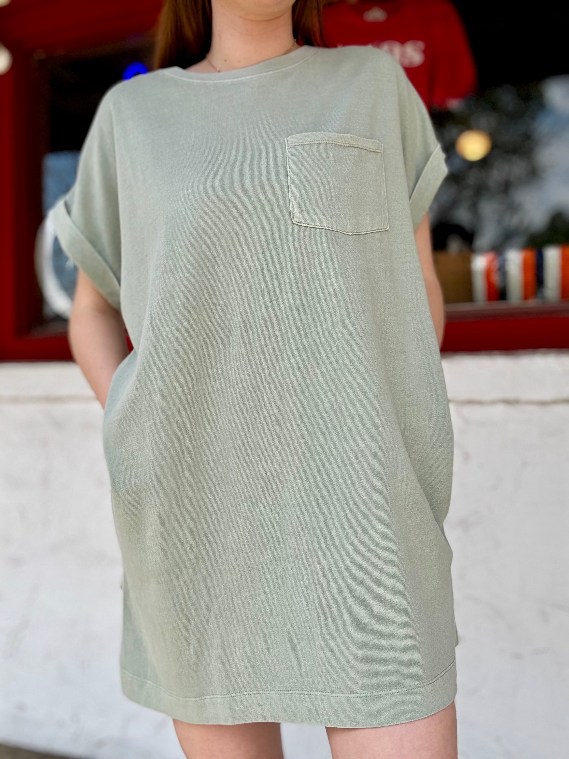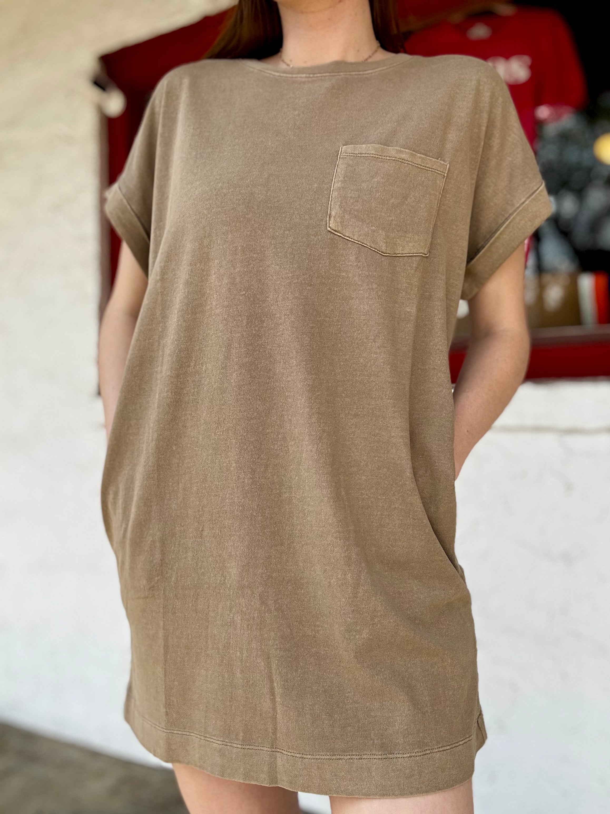 This relaxed crewneck mini t-shirt dress features cuffed short sleeves and a single front patch pocket. Additionally, discreet side-seam pockets combine comfort with subtle practicality. Made with soft cotton with a pigment dye finish, this dress can be paired with sneakers for a laid-back weekend