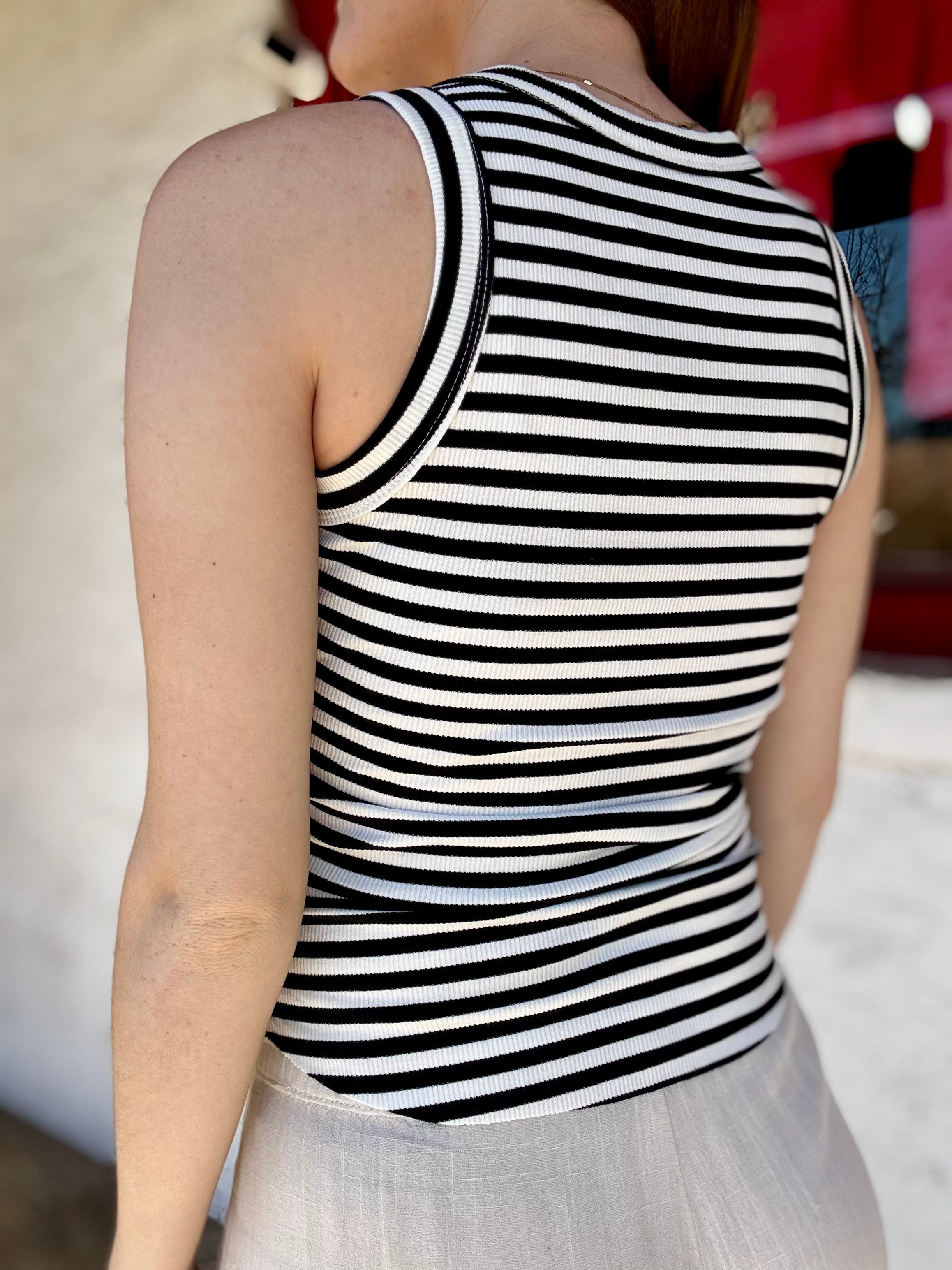 A ribbed tank featuring a streamlined racerback and classic stripe pattern. Pair with denim shorts for a relaxed summer vibe.