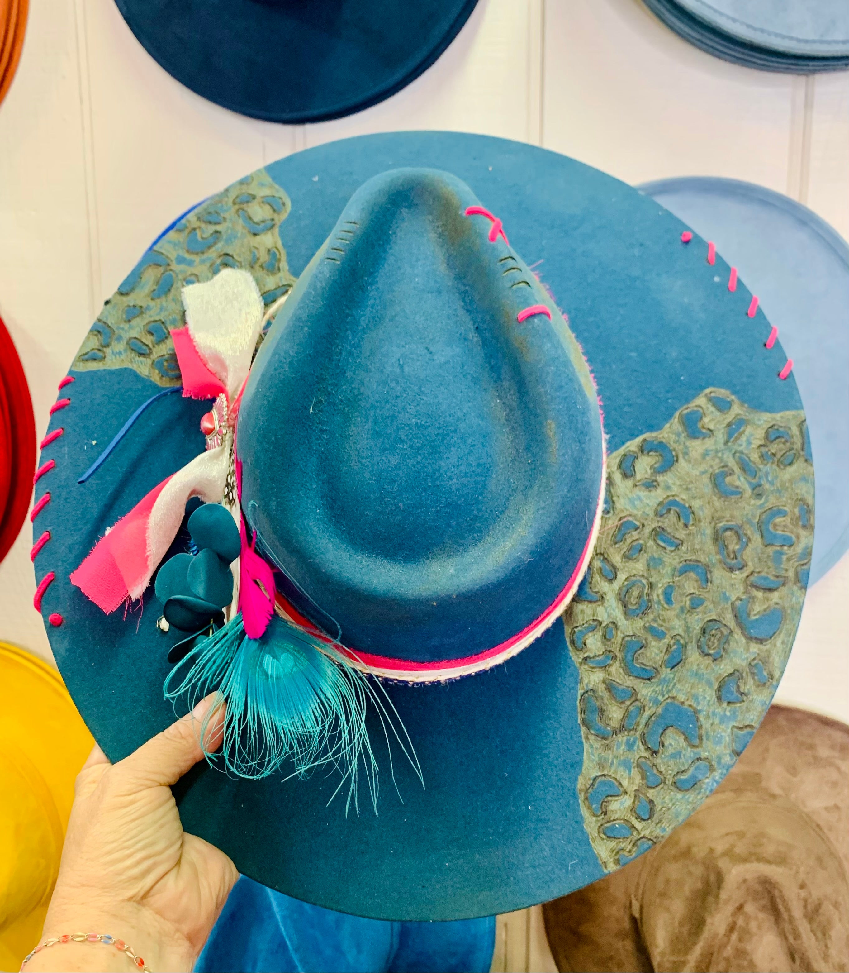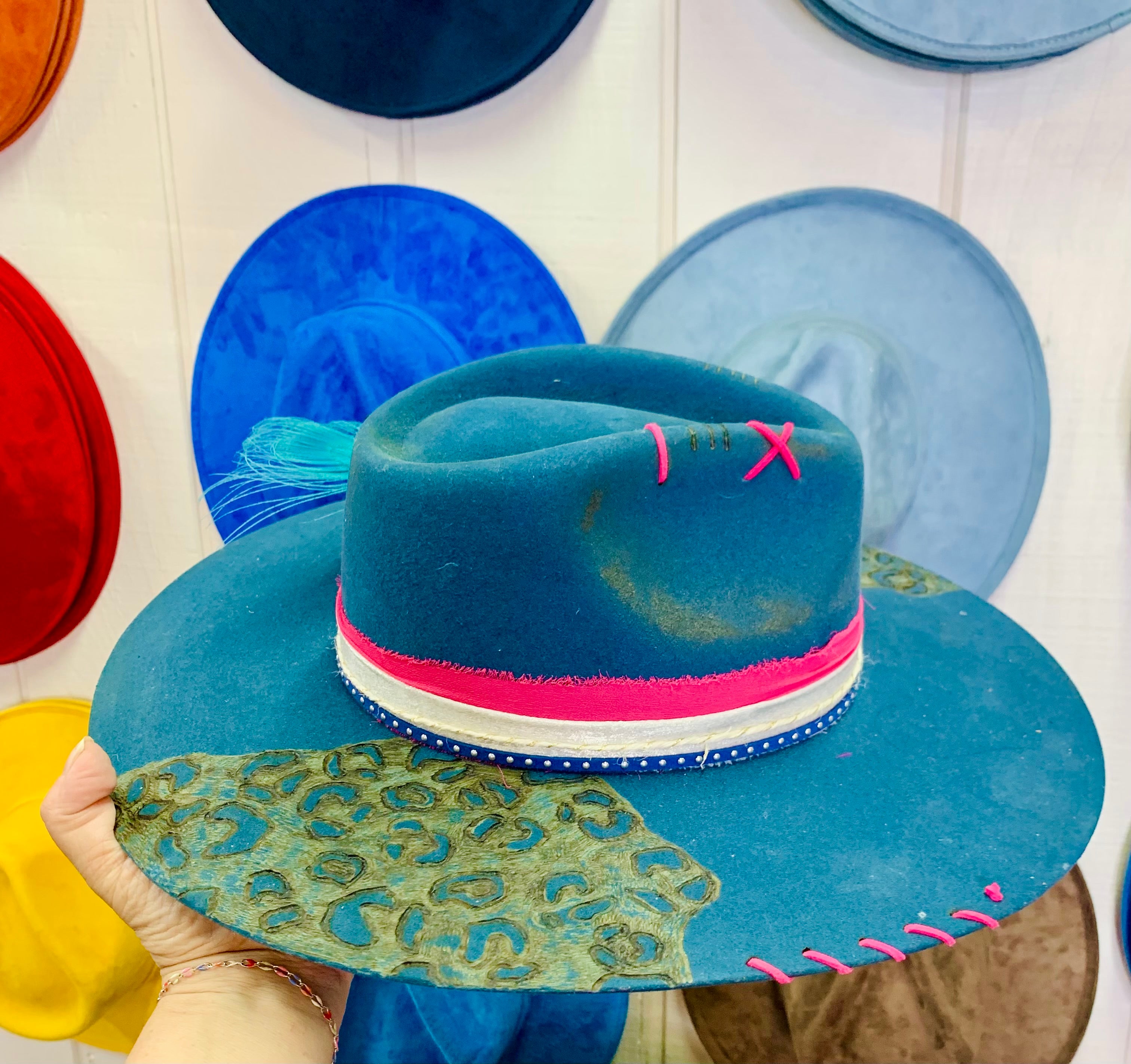 Make a bold statement with our custom Blue Hand Burned Drifter Felt Hat! Each hat is truly one of a kind, hand burned with a stunning leopard print design. Adorned with a playful pink and white fabric and accessories for the perfect finishing touch. Stand out from the crowd and express your unique style with this unforgettable hat!