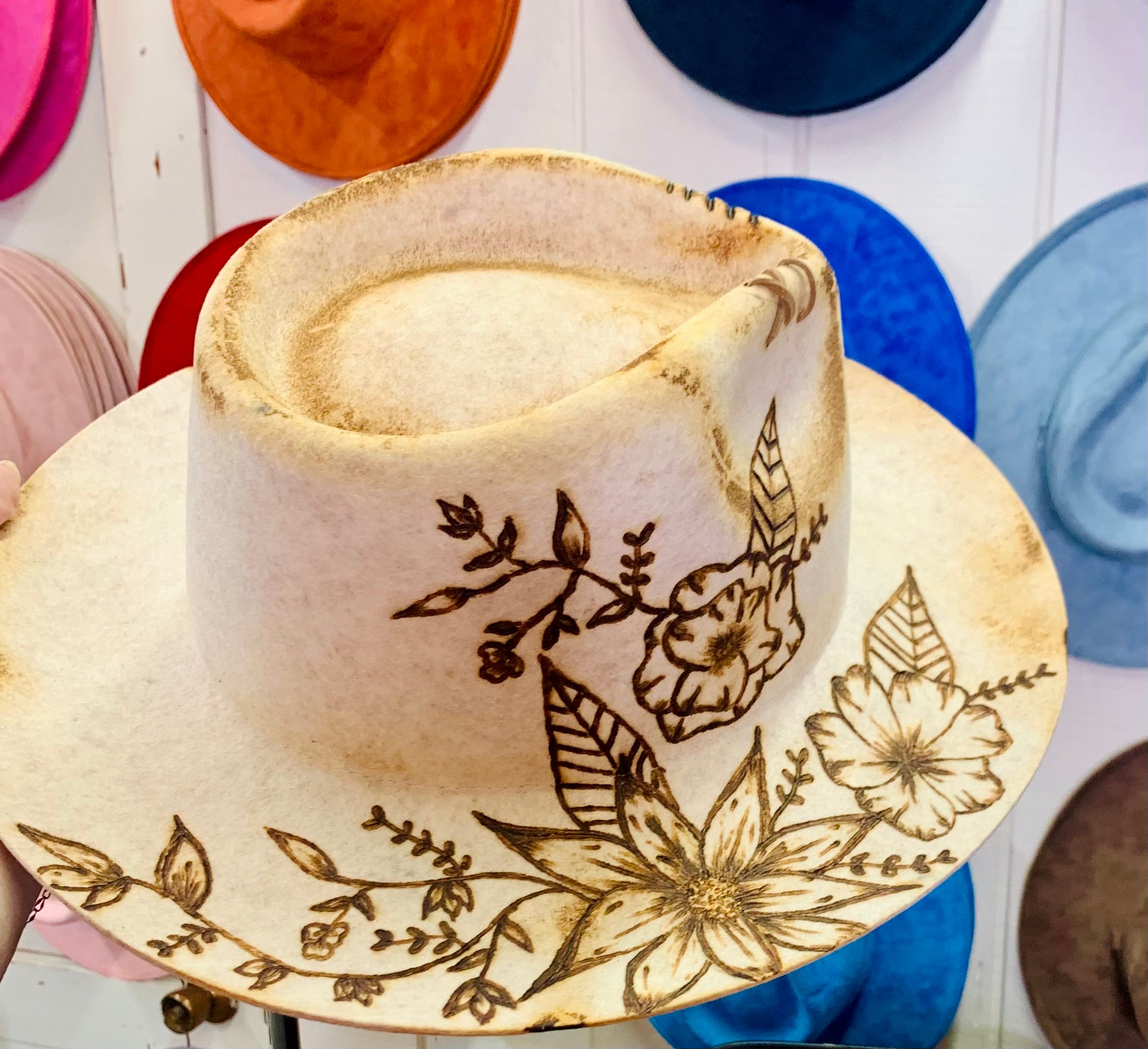 Unleash your unique style with our Handburned Gigi Pip hat, handcrafted with care and one of a kind. Each design is individually hand burned, making this hat a stunning and exclusive accessory. Available in size 59. Elevate your wardrobe and stand out from the crowd!