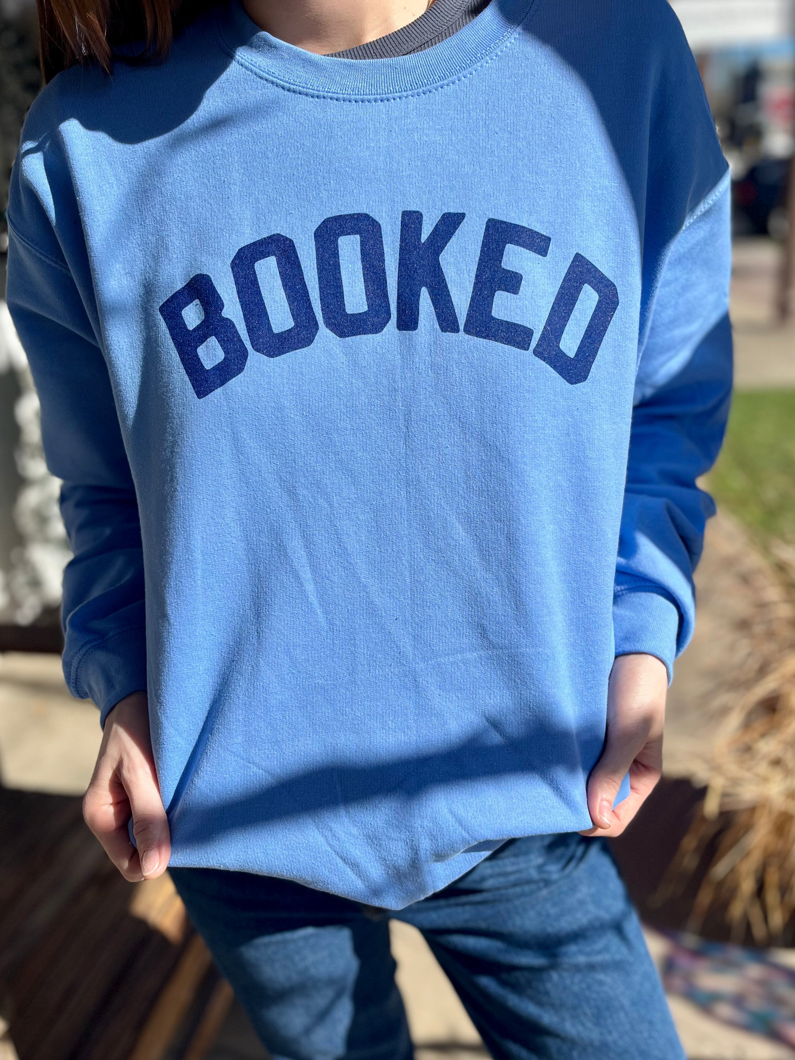 Get cozy and show off your love for books with our Booked blue crewneck sweatshirt! This light blue sweatshirt is professionally screenprinted with a vibrant design that any book lover will appreciate. Perfect for chilly days spent curled up with your favorite read. Make a statement with this must-have addition to your wardrobe.
