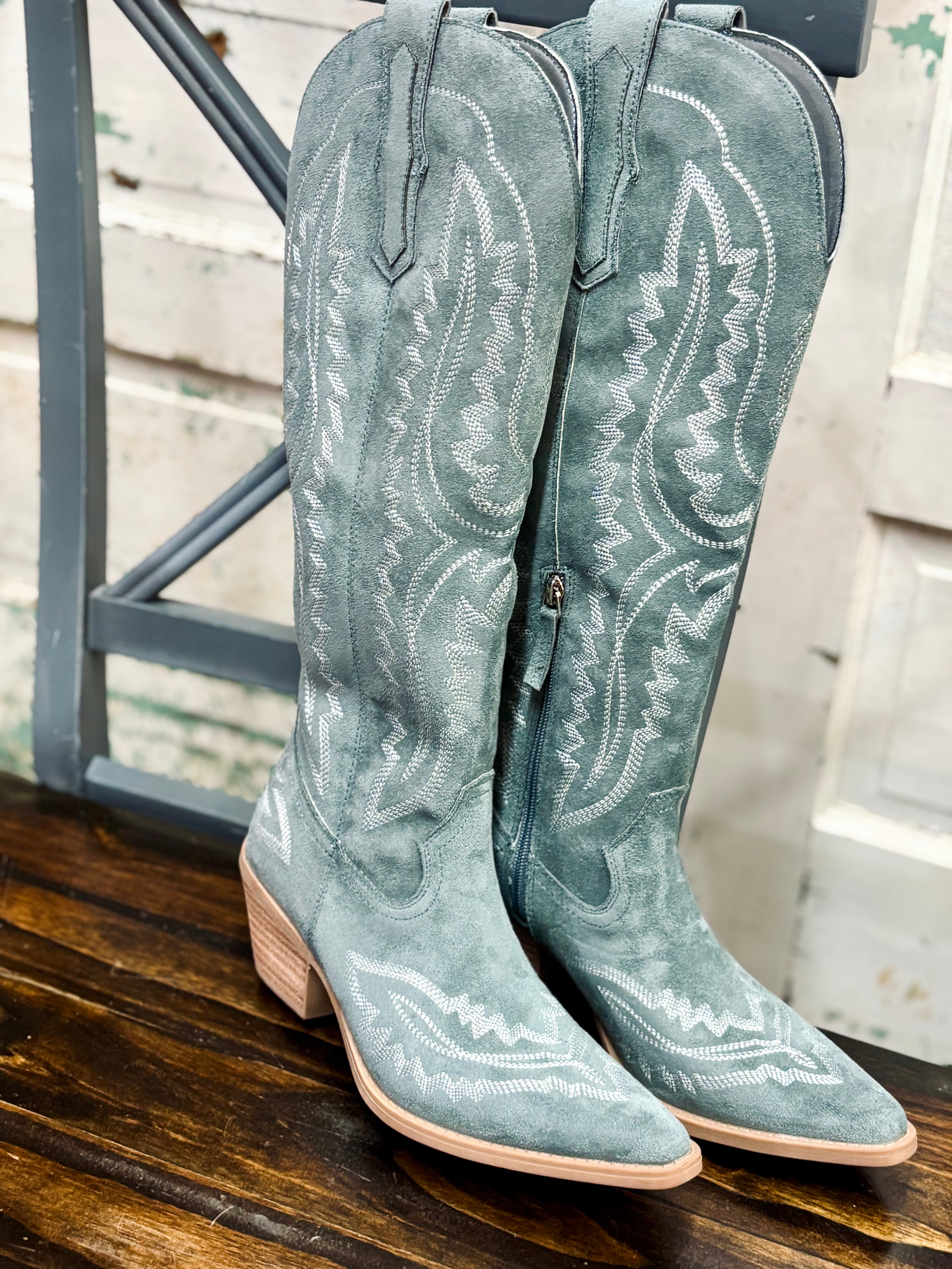 Step into style and comfort with our Tess western stitch blue cowgirl boots. The denim blue color, intricate embroidered stitching, and convenient side zipper make these knee high boots a must-have for any fashion-forward cowgirl. Elevate your outfit and rock the rodeo with these western-inspired boots.