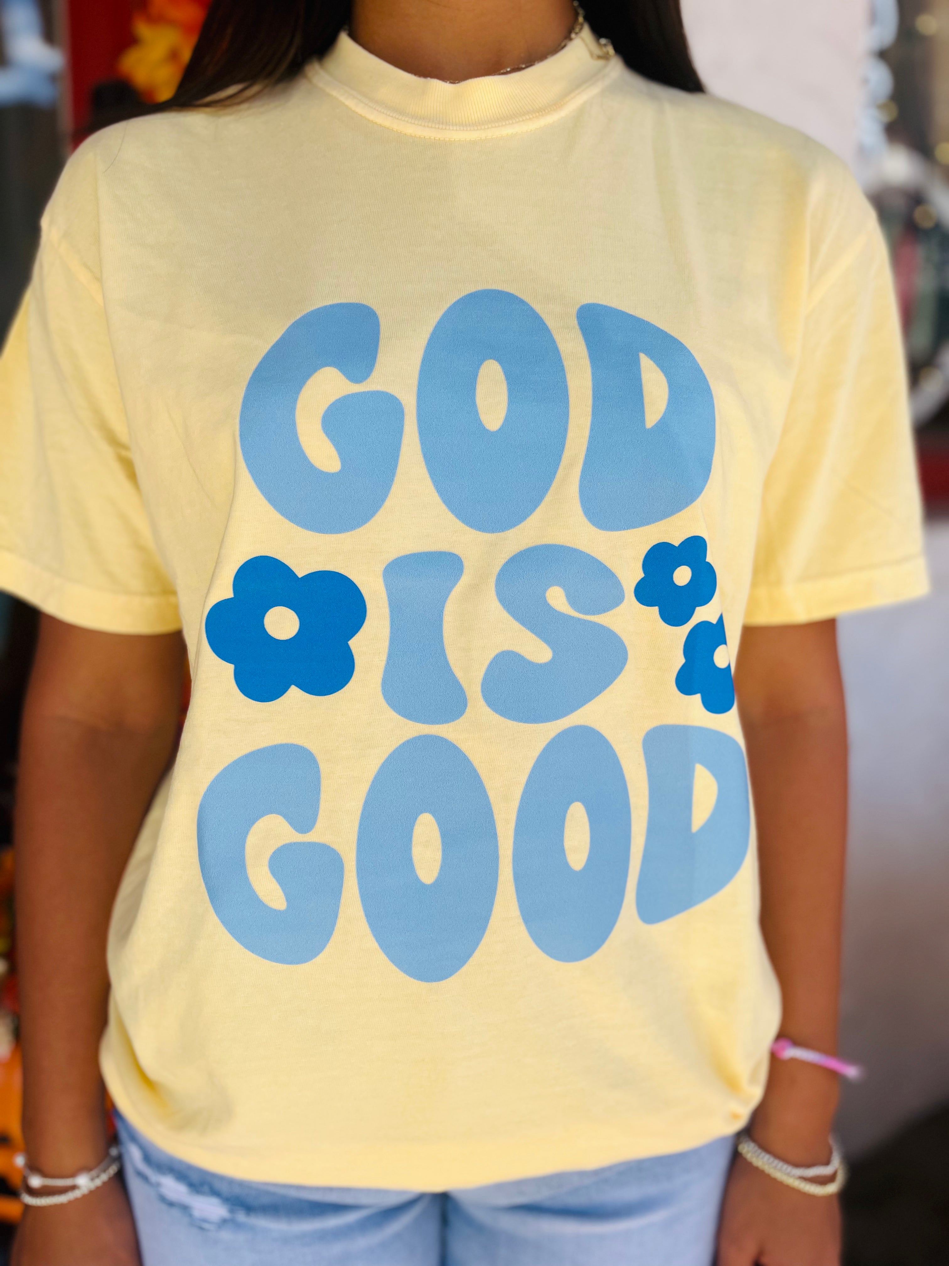 This God is Good butter yellow tee is perfect for anyone looking for a faith-based fashion statement. The professionally screenprinted blue ink design pops against the soft butter yellow fabric, making this unisex fit t-shirt a must-have for showing off your love and belief in a higher power.