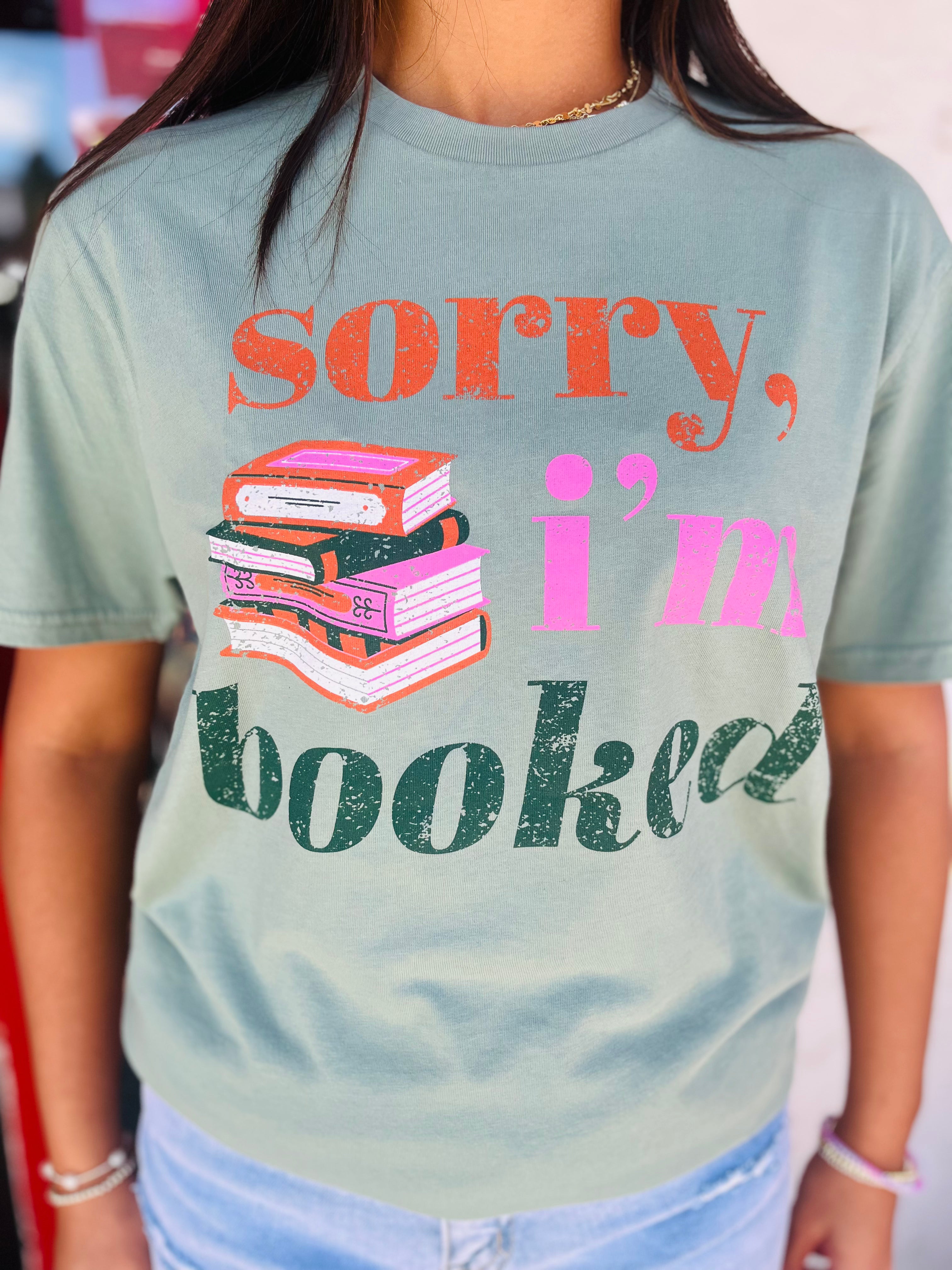 This Sorry I'm Booked graphic tee is perfect for any book lover. With a heather green color and a bookish design, this unisex tee is both comfy and stylish. Perfect for casual wear or as a gift for a fellow bookworm. Book lovers, this tee is for you!