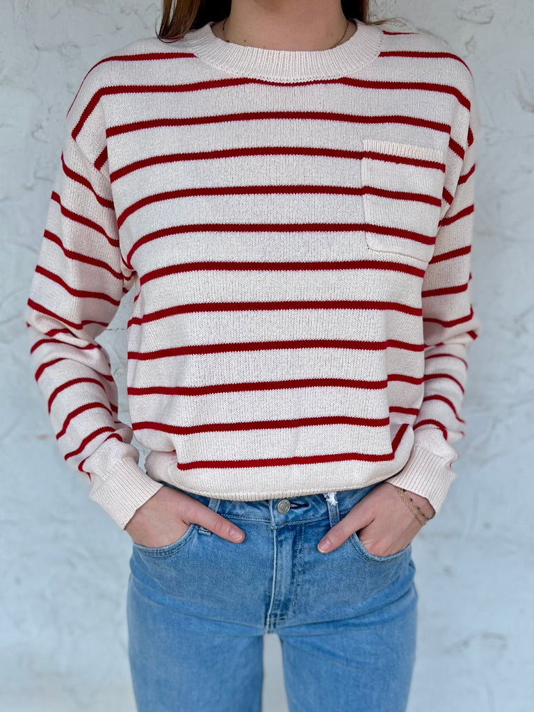 Stay cozy and stylish with our Round Neck Raglan Long Sleeve Stripe Pocket Sweater. Available in green and red stripes, this cream sweater features a classic round neck and convenient pockets. Elevate your winter wardrobe with this must-have piece.