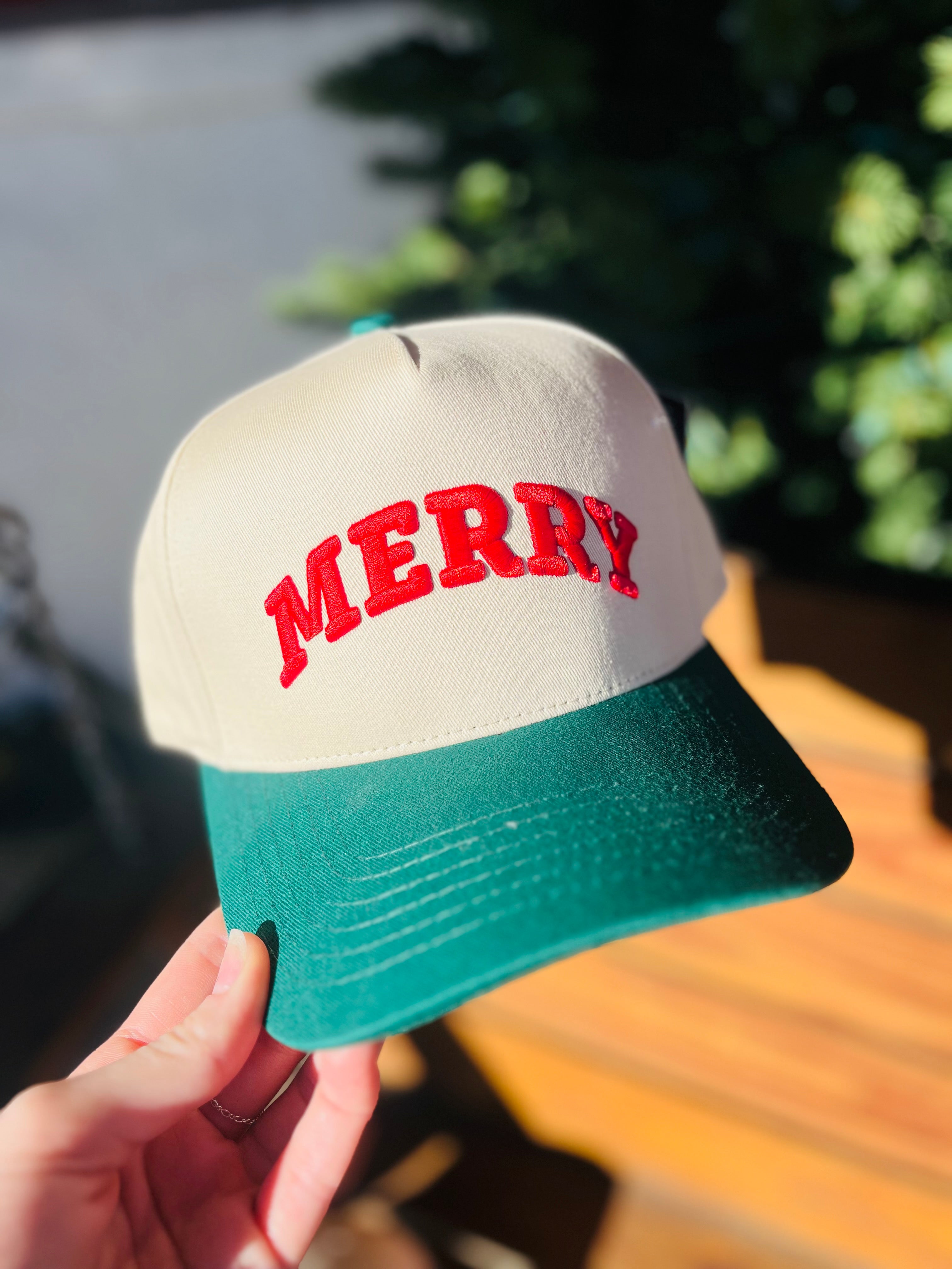 Holiday Embroidered Cap - MERRY is backordered and will ship as soon as it is back in stock.
