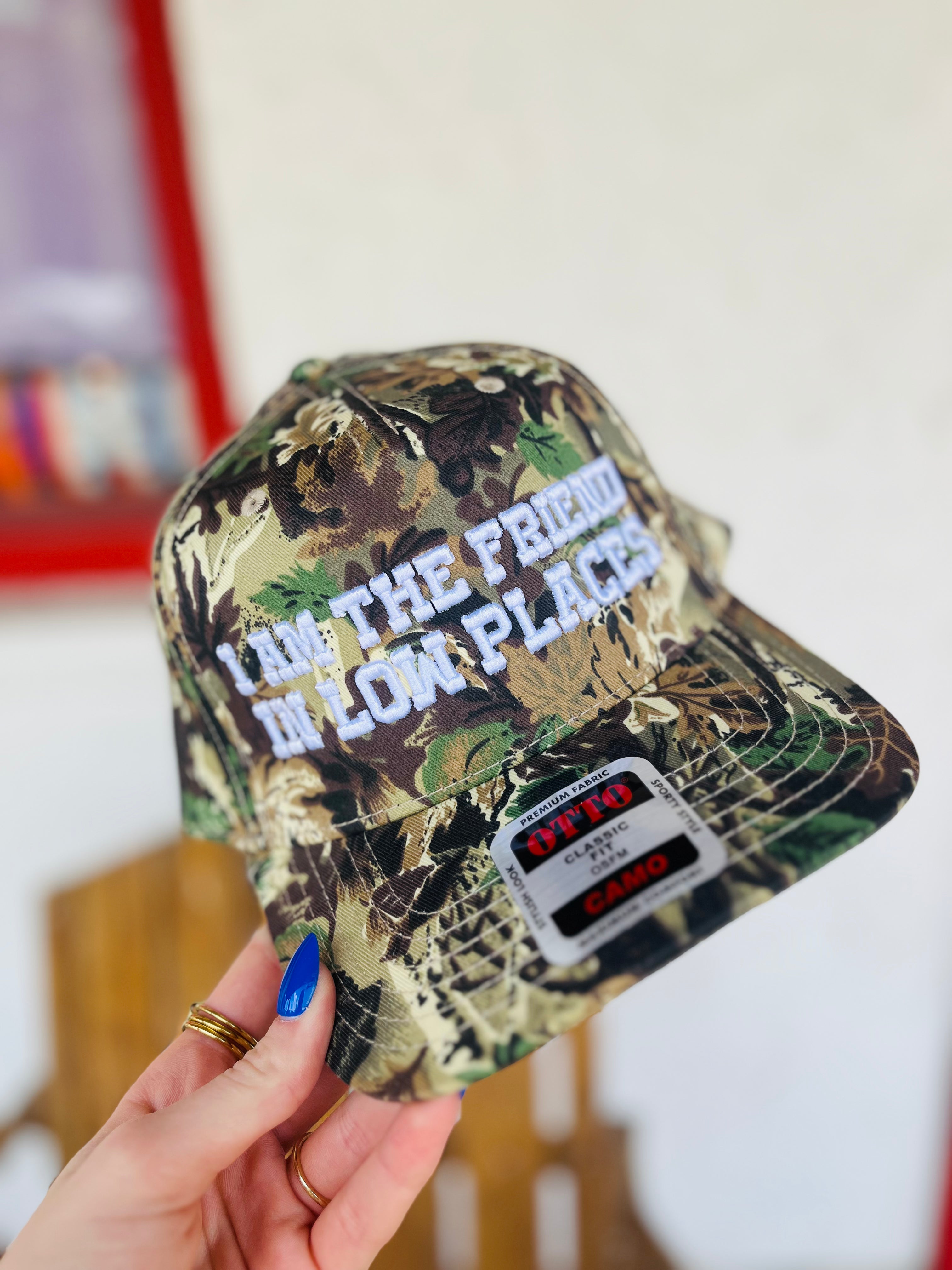 This embroidered camo trucker hat combines rugged style with playful charm, making it your go-to accessory for summer adventures. The "I am the friend in low places" design adds a fun, personal touch. Perfect for outdoor fun or casual days, this hat blends comfort and character effortlessly.