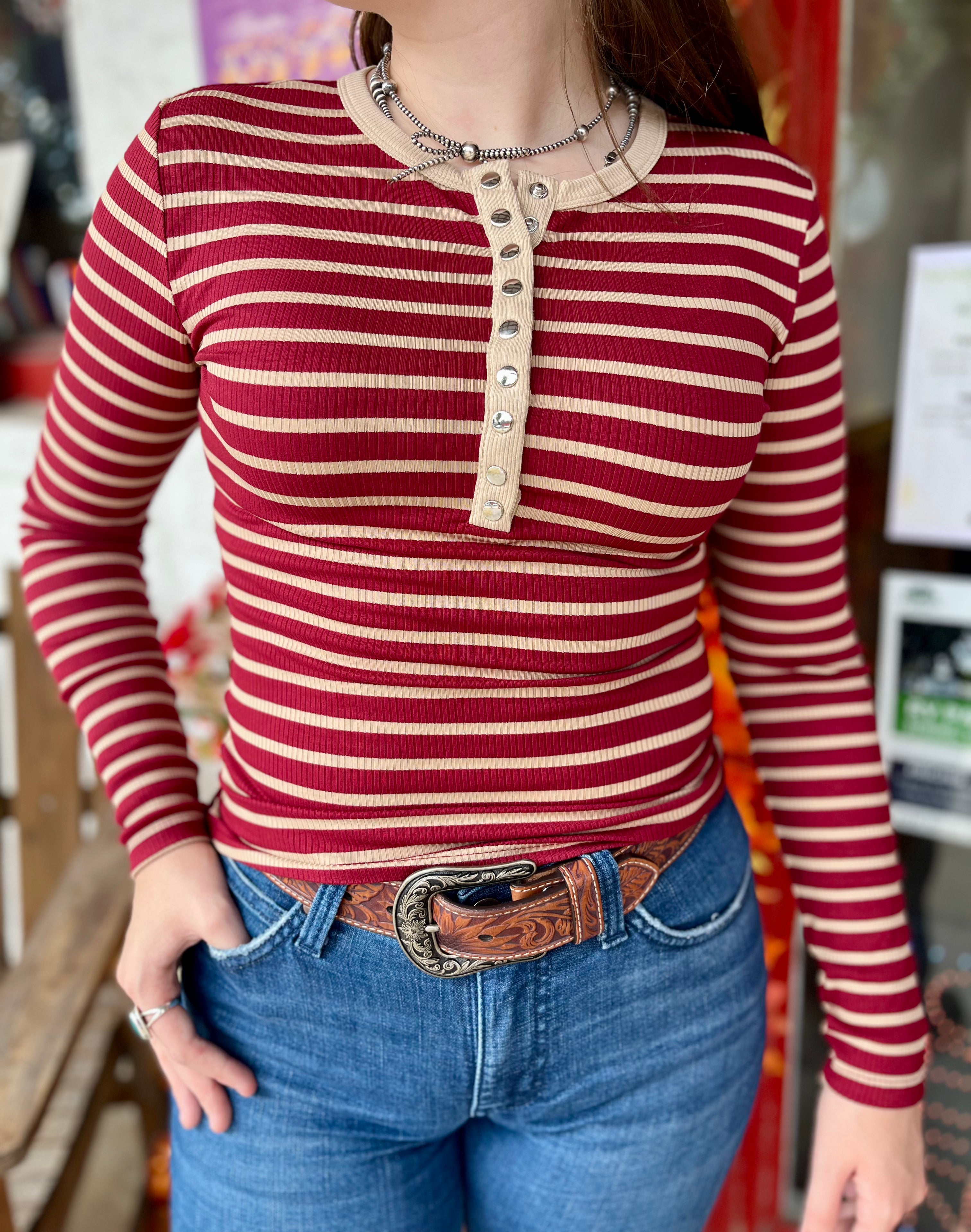 "Get ready to snap up some style with our Stripe Henley Snap Button Ribbed Top. This fitted long sleeved top is made of ribbed material and features snap buttons for added detail. Stay on-trend and add a touch of playfulness to your wardrobe. (Two snaps for this top!)"